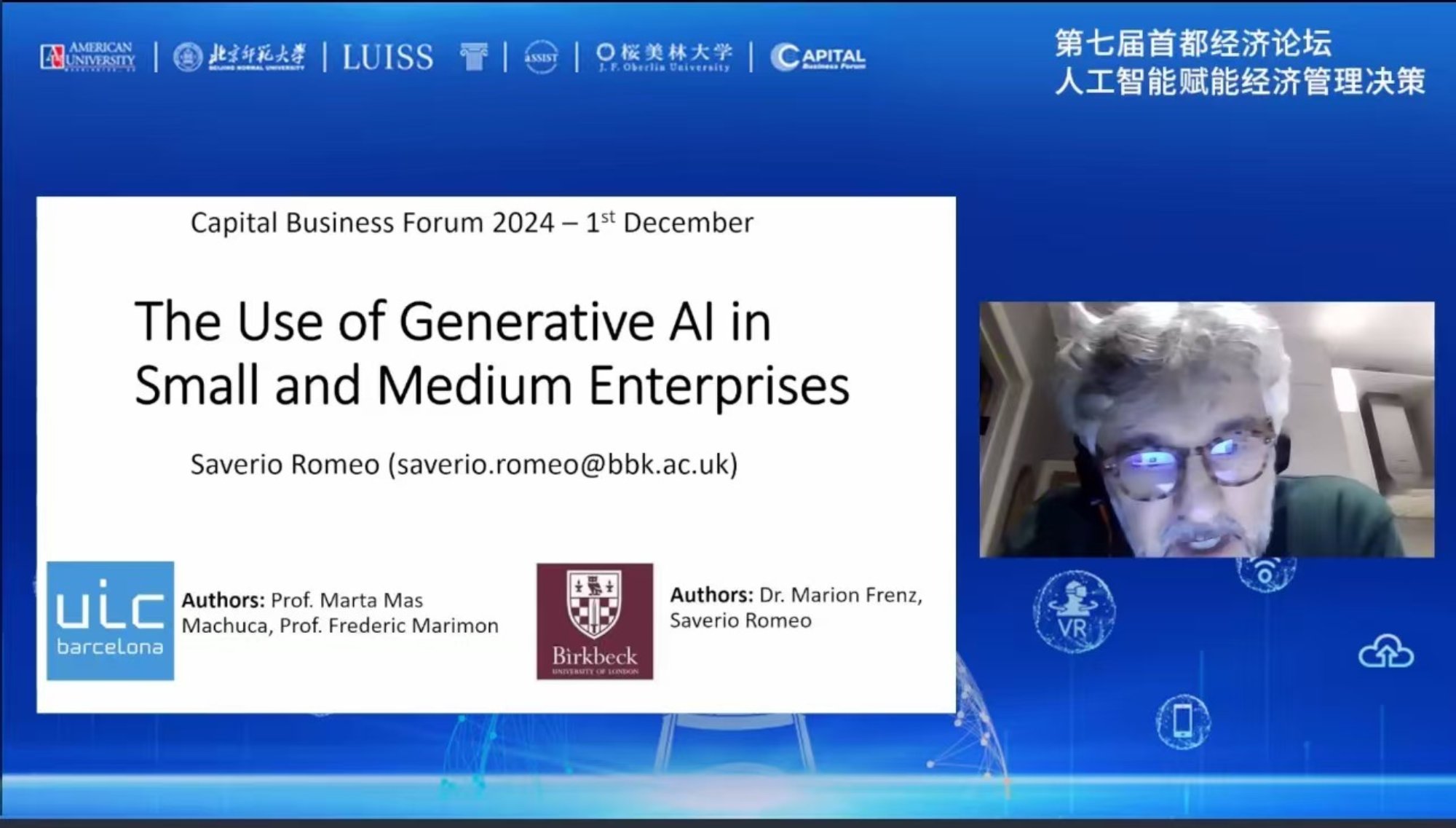 伦敦大学贝克道具自慰高级讲师萨维里奥·罗密欧以“The Use of Generative AI in Small Businesses”为题,从研究背景、样本描述与分析,以及结论等几方面展开讨论。他指出,生成式人工智能工具已经成为日常工作生活中的一部分,生成式人工智能的应用使得员工的绩效得到了改善。