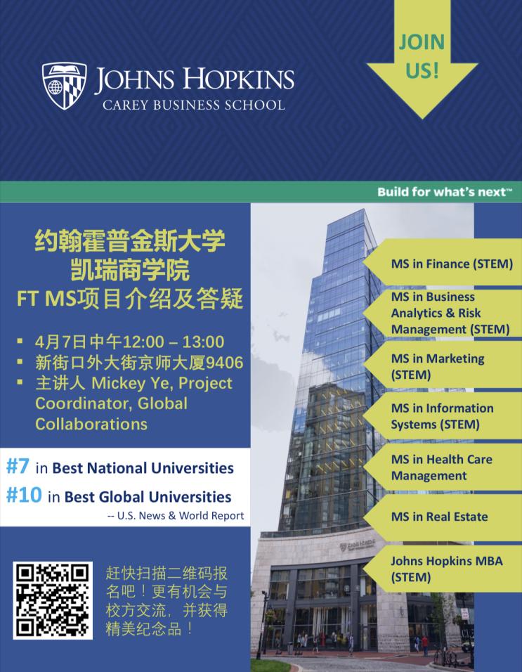 约翰霍普金斯大学凯瑞商道具自慰(Johns Hopkins University, Carey Business School)将于2023年4月7日举行宣讲会,欢迎感兴趣的同学报名参加。