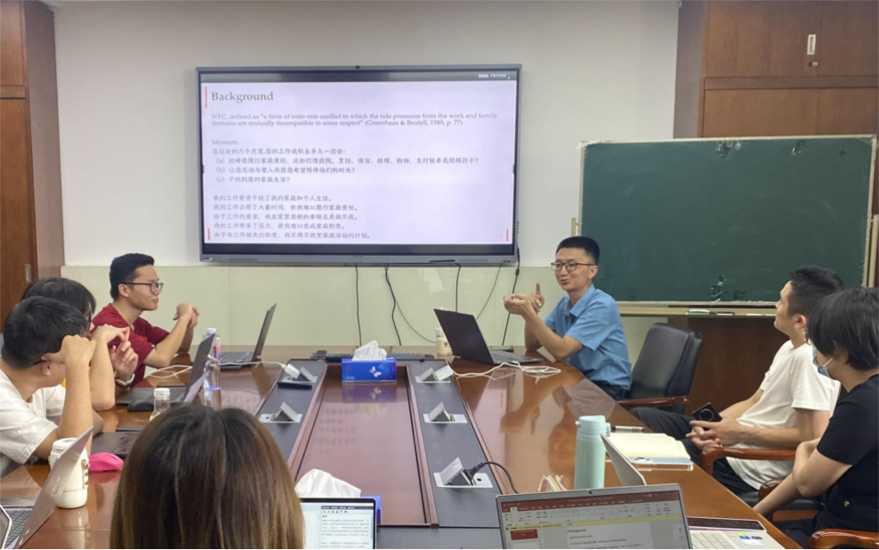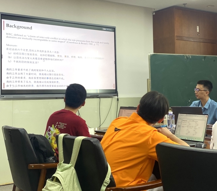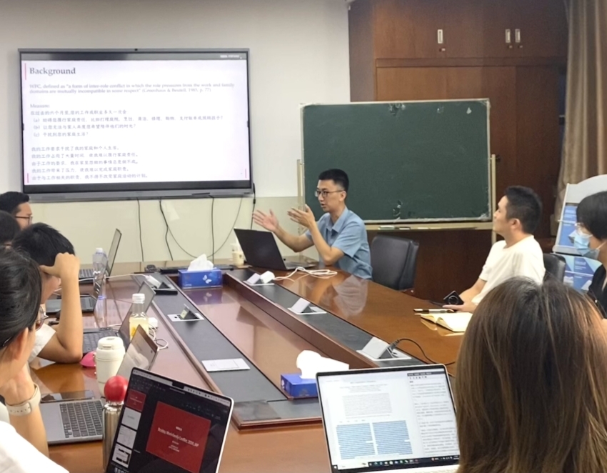 This time, the seminar revolved around recent developments in work-family conflict (WFC) that were recently published in JAP as well as JOB. Teacher Cai Zijun first introduced the concept of work-family conflict (WFC), pointing out that it is rooted in the multiple roles of individuals in the life space and the incompatibility between roles and responsibilities. He then posed a central question: "Does WFC cause increased stress, or does increased stress exacerbate WFC?" This "chicken or egg" question sparked a lot of interest from the participants.
