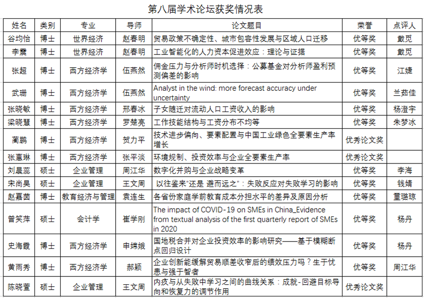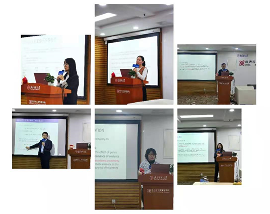 The next part was the academic exchange of the participating students. Gu Junyi's report was titled “ Trade Policy Uncertainty, Inclusive Urban Development and Regional Migration” ,  Ms. Dai Mi gave her affirmation and suggestions from the perspectives of creativity, empirical accuracy and writing norms. The title of Li Zhen's report was "The Human Capital Promotion Effect of Industrial Intelligence: Theory and Evidence". Teacher Dai Mi believed that this article showed the characteristics of a mature academic researcher, and also put forward suggestions for further improvement from the theoretical perspective. The title of Zhang Chao's report was Commission Pressure and Analyst Timing Choice: The Influence of Public Offering Funds on Analyst's Profit Forecast Dices . Teacher Jiang Jie affirmed his workload and research conclusion, and suggested that his research ideas should be clearer and focused, and the influence mechanism should be highlighted. Wu Shan's report was titled "Analyst in the Wind: More Forecast Accuracy Under Uncertainty" . Lan Rujia pointed out that the topic of this paper was novel, close to the current epidemic situation, and the story of China was told well. Meanwhile, she also proposed that it could be further strengthened in terms of innovation and economic significance. The title of Zhang Xiaomin's report was "The Influence of Children's Accompany Movements on the Wage Income of Floating Population" . Yang Chengyu first affirmed the empirical research on its norms, and suggested further exploring the economic mechanism behind it to strengthen the theoretical basis. The title of Liang Xiaohui's report was "Work Skilled Structure and Wage Inequality Distribution" . Teacher Zhu Mengbing thought that it has clear ideas, rigorous methods and smooth writing. At the same time, she also pointed out that the introduction and research angle can be further optimized.
