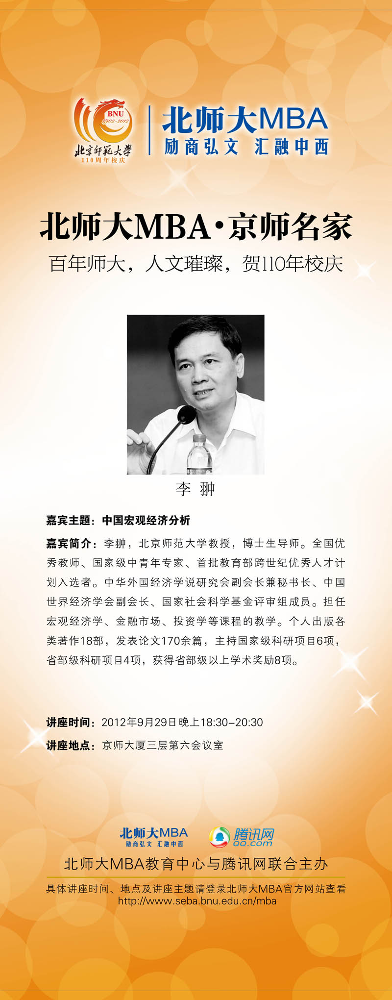 9月29日讲座预告:贺校庆·京师名家讲座(6)——北师大MBA邀请经济学名家李翀教授谈“中国宏观经济分析”