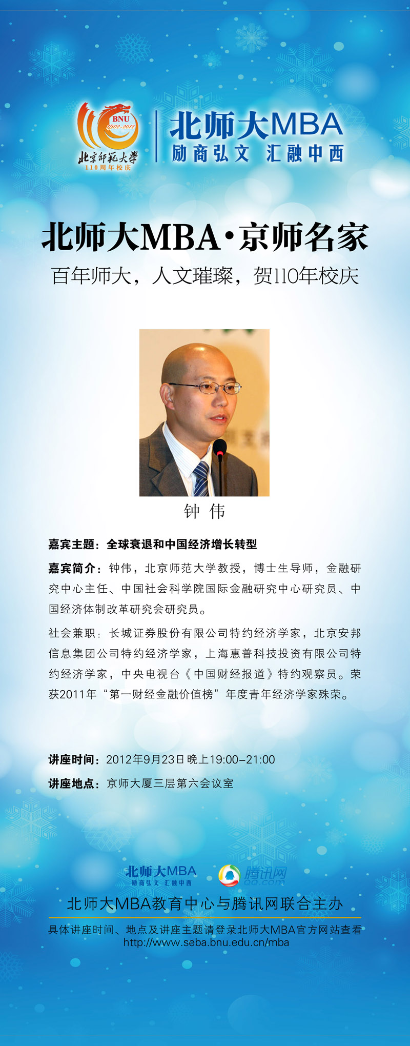 9月23日讲座预告:贺校庆·京师名家讲座(5)——北师大MBA邀请金融学名家钟伟教授谈“全球衰退和中国经济增长转型”