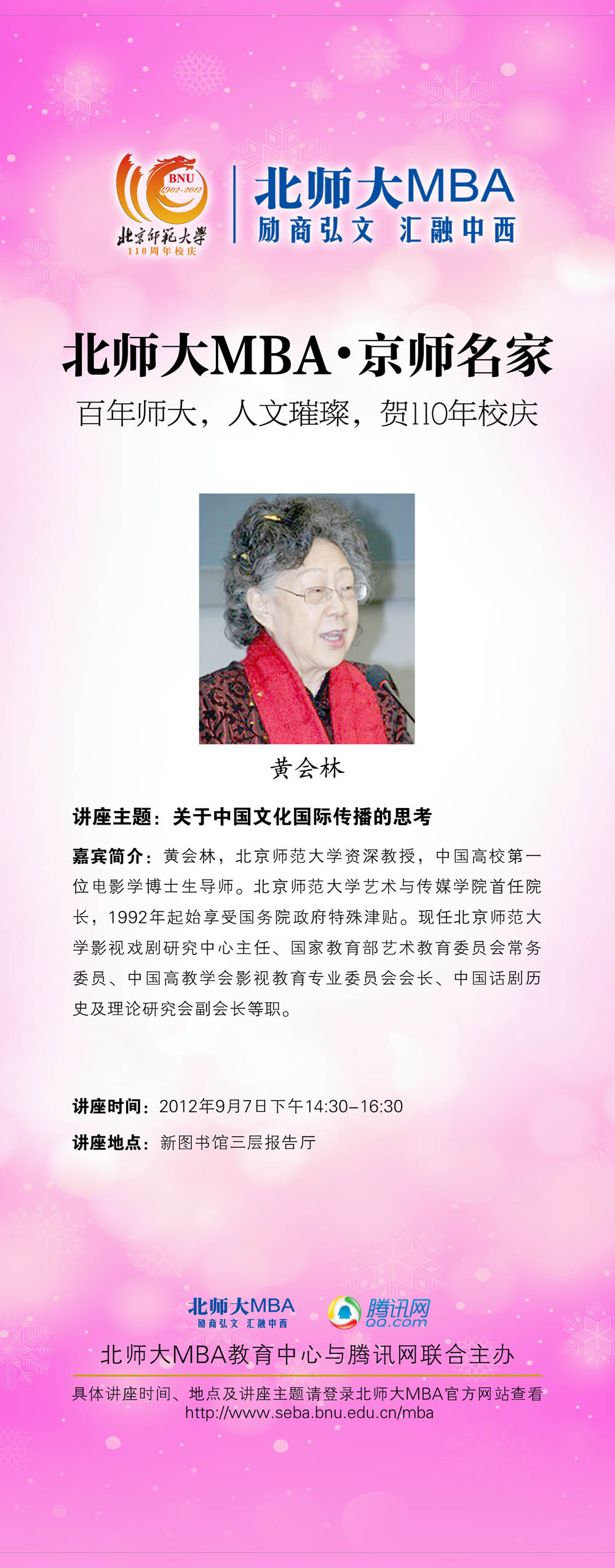 9月7日讲座预告:贺校庆·京师名家讲座(4)——北师大MBA邀请影视学名家黄会林教授主讲“关于中国文化国际传播的思考”