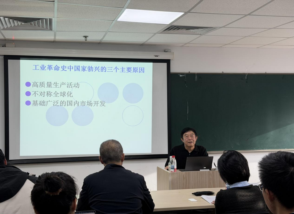 贾根良教授在讲座中,结合西班牙、英国、德国、美国等欧美国家经济史与演化经济学视角,解析了工业革命进程中国家兴衰的核心原因。国家兴起需满足三大关键条件:一是以高质量生产活动为核心,其具备创新机会窗口大、收益递增、不完全竞争的特征,英、德、美、日等国的崛起均遵循这一规律;二是实施不对称全球化战略,凸显新兴工业力量 “异地物种形成原理” 与颠覆式创新所需战略性市场空间的重要性;三是基础广泛的国内市场开发,以消费为核心的内需与国内经济一体化,是迈入发达国家的基本前提。国家衰败的两大主要因素则是金融化与制造业大规模海外转移:经济重心过度倾斜金融、脱离实体产业,叠加核心制造业外迁,会导致产业空心化、技术积累断裂,最终丧失经济竞争力。贾根良教授基于历史经验,为当前世界及中国经济发展提供了独到见解;同时从工业革命的历史实践出发,提炼出国家兴衰的核心密码,既深入解读了历史规律,也为当代国家发展战略的制定提供了宝贵启示。